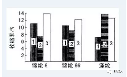 1一沸水改缩;2一热空气收缩【190℃×15 min);3-饱和蒸汽收缩(锦纶6为125℃×3 min,锦纶66和涤纶为130℃×3 min)
