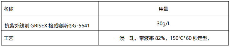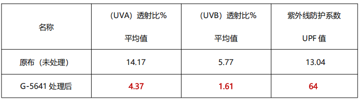 1)面料经过抗紫外线剂 GRISEX 格威赛斯®G-5641 处理后,抗紫外线能达到 UPF 值 50+要求;
