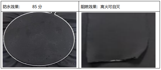 -高效工艺:对涤氨(85/15)弹力黑色面料(185g/㎡),以一浸一轧方式,将阻燃与防水剂同浴施加,随后经一次烘干定型即完成全部功能整理。
